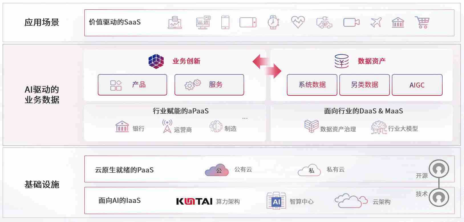 数字时代,,,,围绕企业数字化转型的关键要素,,拉菲2平台数码开创性的提出数云融合战略和技术体系框架,,,着力在云原生、、、、数字原生、、、、AI原生和信创产业上架构产品和服务能力,,为处在不同数字化转型阶段的快消零售、、、汽车、、、、金融、、医疗、、政企、、、教育、、、运营商等行业客户提供泛在的敏捷IT能力和融合的数据驱动能力,,,,构建跨界融合创新的数字业务场景和新业务模式,,,助力企业级客户建立面向未来的核心能力和竞争优势,,全面推动社会的数字化、、智能化转型升级。。。